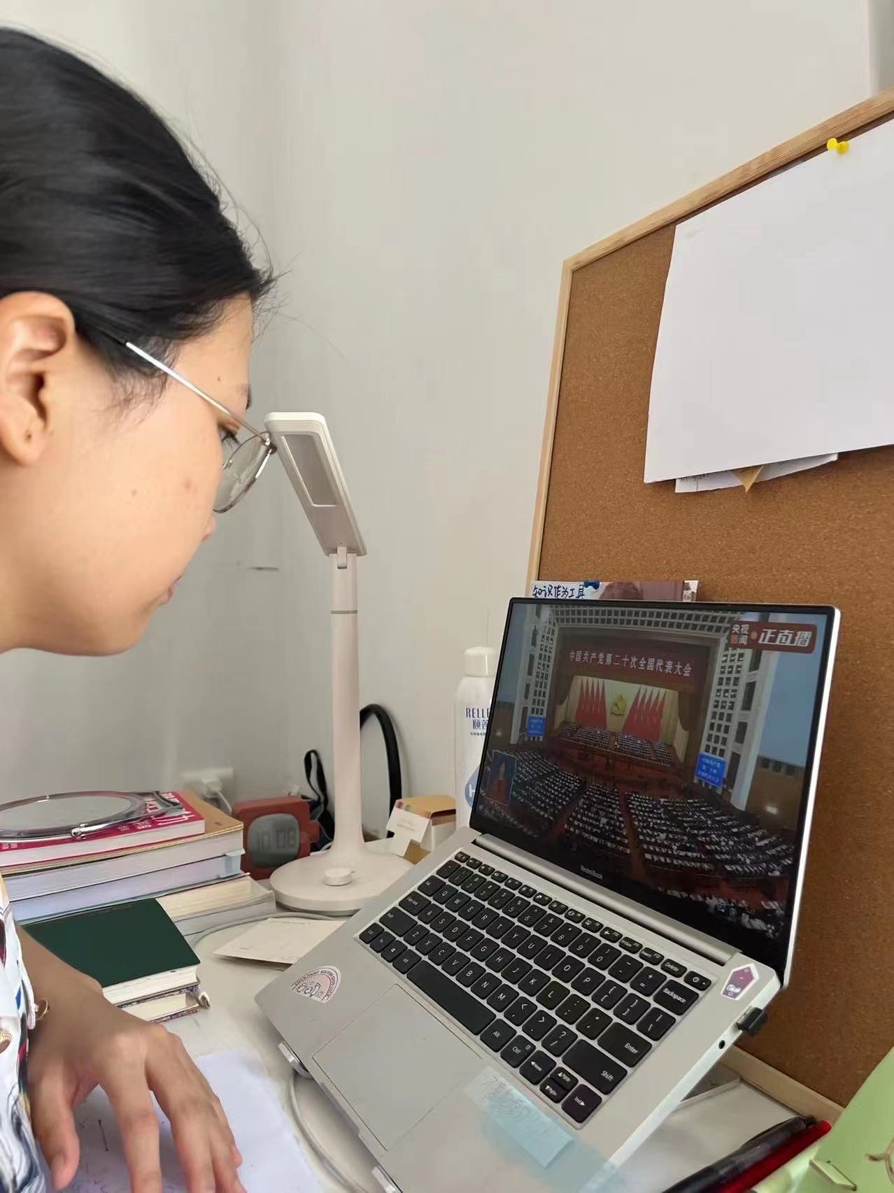 朱康清老师表示:聆听习近平总书记的报告,我受到了极大的鼓舞,认识到作为新时代青年共产党员,应始终坚持听党话、跟党走,与党的步伐始终保持一致,面对百年未有之大变局,要积极响应习近平总书记“踔厉奋发,笃行不殆”的号召,为新时代中国特色社会主义建设和中华民族的伟大复兴尽一份绵薄之力。