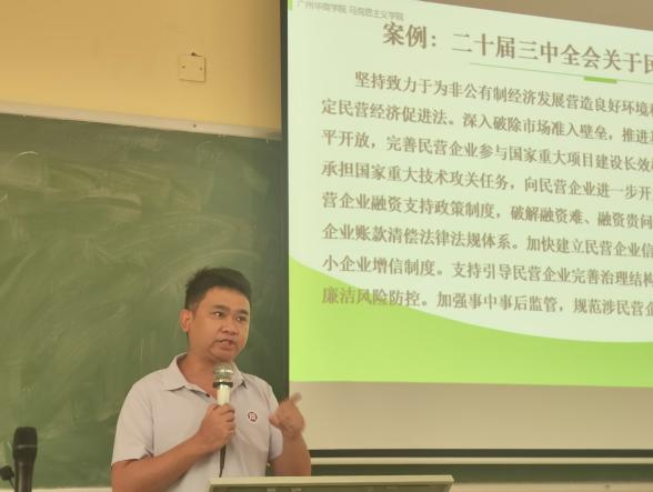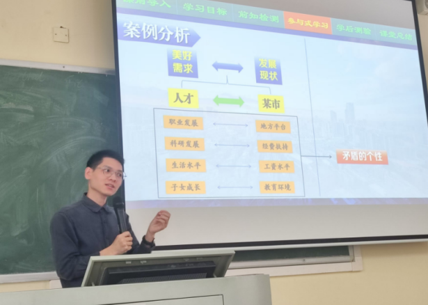 在讲课环节,陈韬老师主讲“思想道德与法治”课,利用 AI助教,并结合党的二十届三中全会相关论述讲解了“理想”的三个特征。蒋云丽老师主讲“中国近现代史纲要”课,她以小见大,从广州起义案例出发,分析了“城市中心论”在中国行不通的原因。李元贵老师主讲“马克思主义基本原理”课,结合地方引才留才的问题讲解矛盾普遍性和特殊性的辩证关系。