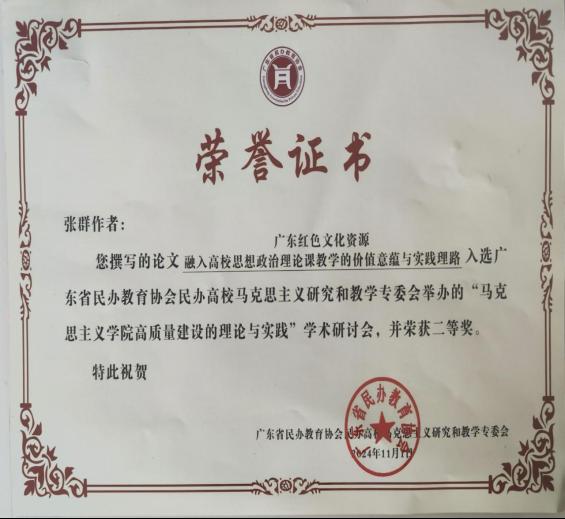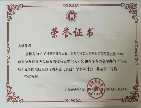 2024年10月31日根据广东省民办教育协会公布“马克思主义学院高质量建设的理论与实践”学术研讨会征文比赛获奖名单,广州华商学院马克思主义学院张群、赖俊锋获得征文比赛二等奖,姜波获征文比赛三等奖。