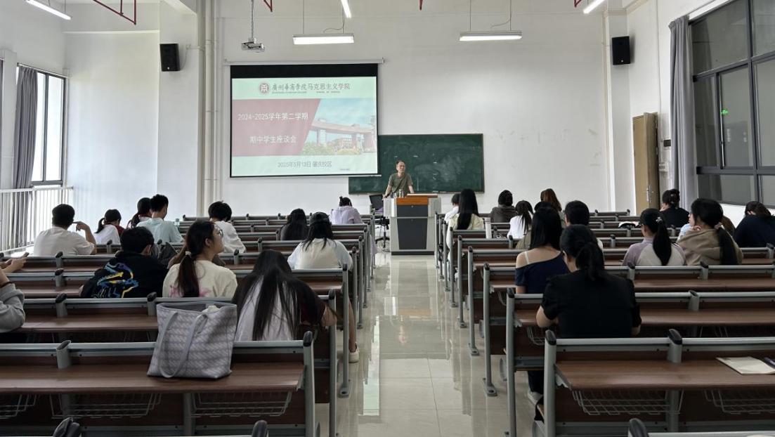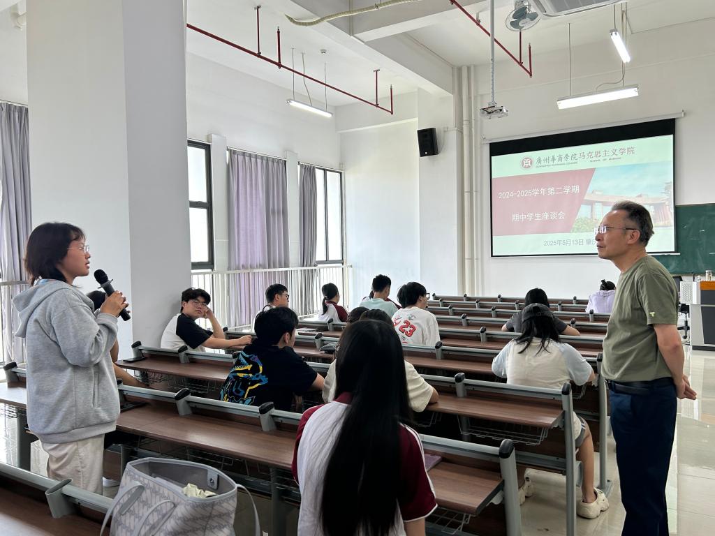 为进一步倾听学生学习思政课的心声,了解学生对思政课教学工作的意见与建议,切实提升思政课的育人实效,马克思主义学院于2025年5月13日下午在肇庆校区6号楼301教室召开了学生期中座谈会。会议围绕思政课的教学安排、授课方式及实践教学内容设计等方面展开交流,广泛听取学生的反馈与建议。