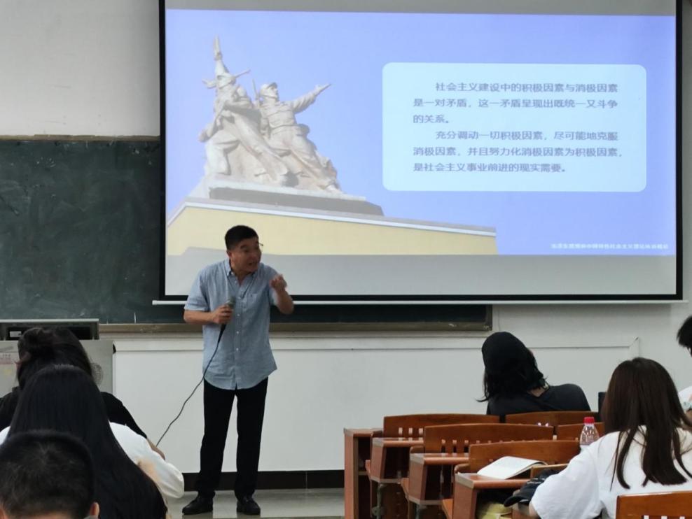 为深入贯彻党的教育方针,积极推进思政课守正创新,构建教学经验交流的平台,广州华商学院马克思主义学院于2025年5月14日举办了《毛泽东思想和中国特色社会主义理论体系概论》示范教学活动,由曾获得过国奖的韩教授主讲《社会主义建设道路初步探索的理论成果》。韩教授运用高超的课堂教学智慧,巧妙融合生动案例与理论深度,为全体教师上了一堂具有针对性和吸引力的思政示范课。