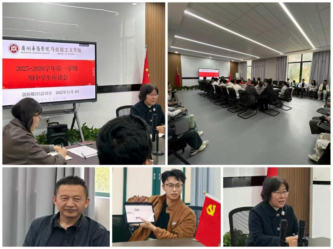 为深入推进思政课教学改革,全面提升教学质量,以优异状态迎接学校本科教学工作合格评估,献礼20周年校庆,马克思主义学院于2025年11月4日14:20在创新楼315会议室召开了2025-2026学年第一学期广州校区学生期中座谈会。学院分管教学工作的副院长胡立娟主持会议,各教研室负责人和教师代表与来自不同年级、不同专业的学生代表齐聚一堂,围绕思政课教学内容、方法及课堂氛围等话题展开深入交流。