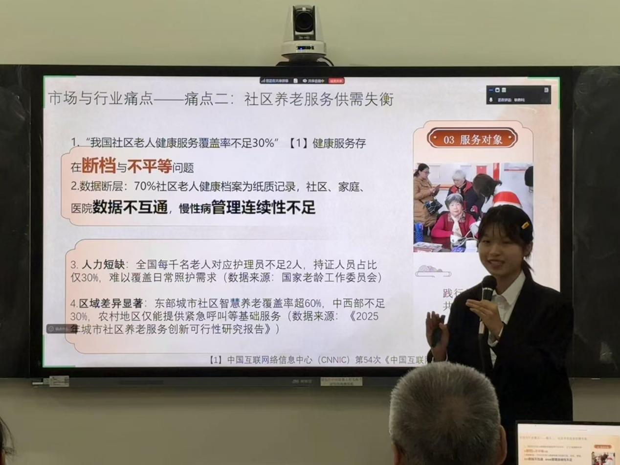 随后,在主持人陈文婕的引导下,10支队伍同台竞技,各展风采。10个项目涵盖思政+专业、思政+公益两个赛道,内容涉及养老、汉语推广、文旅、中草药、剧本杀等方面,将思政与专业、科技、公益融合,从创新创业角度赋能乡村振兴及服务社会。