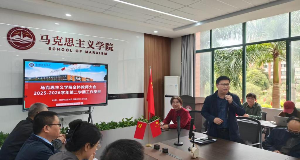 2026年2月26日,广州华商学院马克思主义学院在创新楼315会议室召开新学期全体教职工大会,全面部署2025-2026学年第二学期重点工作。马克思主义学院领导班子成员、各教研室负责人及全体教职工参加会议,会议由行政副院长邹宁军主持。