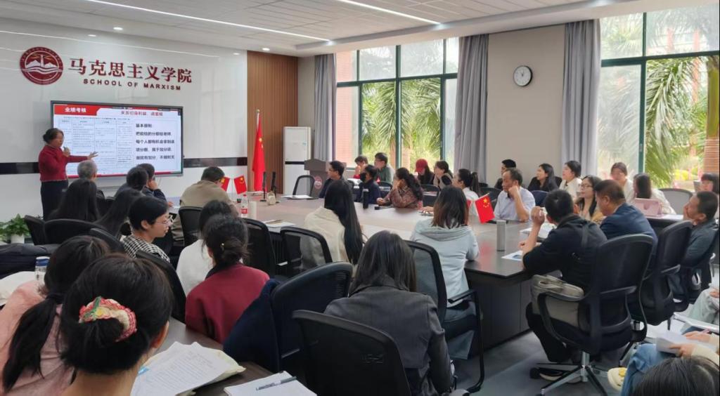 随后,马克思主义学院院长杨明作了题为《攻坚克难、决胜评估、守正创新、再谱新篇:2026年推进思政课高质量发展》的主题报告。杨院长系统总结了过去一年学院在党组织建设、师资队伍建设、教学科研、合格评估及学校二十周年校庆等方面取得的工作成绩。针对新一年的工作,他确立了总体发展目标,并提出以“思政铸魂、文化培根、实践赋能”三维协同推进教学改革的具体路径。报告坚持问题导向与榜样示范,就推动党建工作品牌化建设、配齐建强思政课师资队伍、规范教学过程管理、推进数智赋能以及实施教学科研提升行动等方面,提出了切实可行的任务举措,明确了指标体系建设与保障落实机制,为学院决胜合格评估、实现高质量发展制定了详细的行动方案。