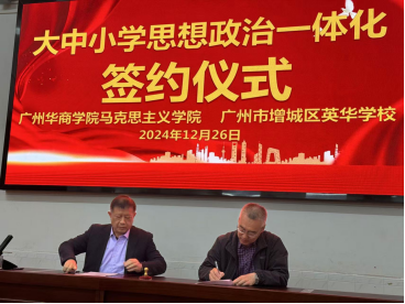2024年12月26日,马克思主义学院院长杨明、院长助理邹宁军一行前往增城英华学校进行教学调研,并与增城英华学校签订了“大中小学思想政治教育一体化”教学实践合作协议。