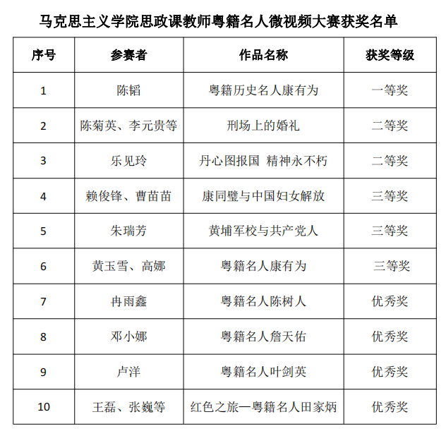 赛后马克思主义学院评委组对作品进行评审,思政课粤籍名人微视频比赛获奖名单如下: