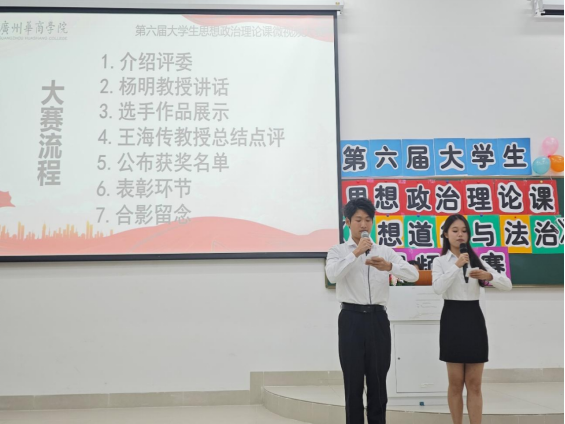 2024年11月18日19:00在肇庆校区16号楼312教室,马克思主义学院联合学生处、校易讯举办了广州华商学院第六届大学生思想政治理论课系列微视频大赛之“思想道德与法治”课“扣好人生的第一粒扣子——华商学生正在说”决赛。