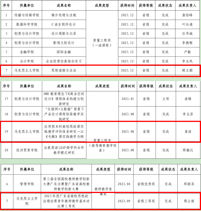 根据《广州华商学院教务处关于开展2023年教育教学标志性成果奖励申请工作的通知》,马克思主义学院胡立娟老师获得校级“质量工程奖(一流课程)”、姜波老师获得“质量工程奖(高等教育教学改革)”、蒋云丽老师获得“教师教学竞赛奖”。