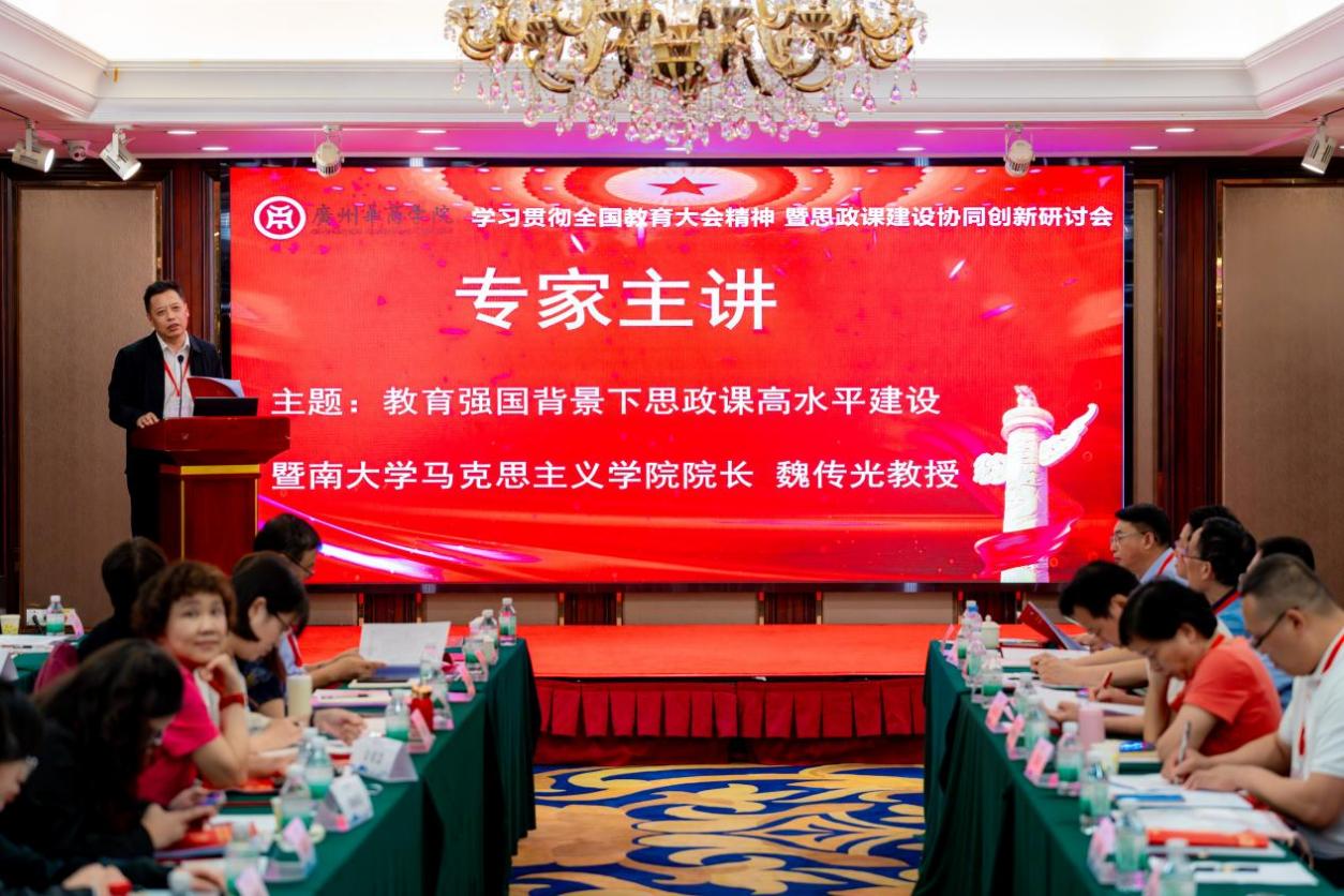 2025年4月18日,由广东省高校思政课区域协同创新中心、暨南大学马克思主义学院主办,广州华商学院马克思主义学院承办,珠海科技学院、广州华立学院、私立华联学院、潮汕职业技术学院协办的“学习贯彻全国教育大会精神暨思政课建设协同创新研讨会”在广州太阳城大酒店成功举办。广东省内多所院校的专家学者齐聚一堂,围绕思政课建设协同创新与高质量发展展开深入交流和深刻探讨。