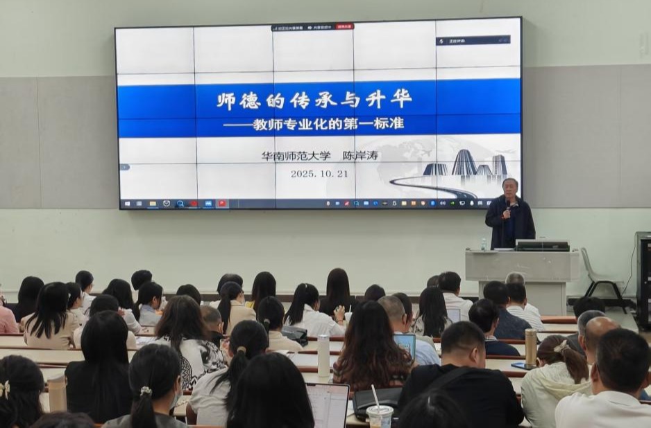 本次师德涵养铸魂专题培训邀请了来自华南师范大学的陈岸涛教授主讲《师德的传承与升华——教师专业化的第一标准》。
